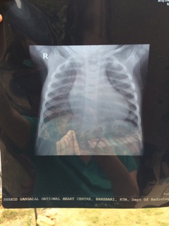 Après notre nuit dans le village de DORAMBA et la visite du dispensaire, une aide soignante nous a parlé d’une jeune enfant Riya Mahaté de deux ans, fille d’une famille d’intouchables, qui avait des gros problèmes de cœur. En effet, elle avait une communication interventriculaire ainsi qu’une énorme cardiomégalie.