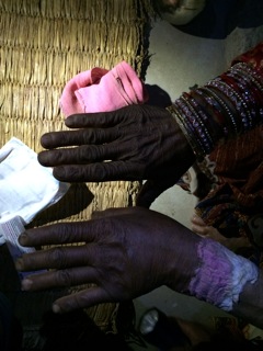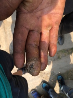 Nous avons été surprise par la blessure de Netra Bahadan. Il y a quelques temps, un gros caillou était tombé sur le doigt de cet homme lorsqu’il travaillait. Son doigt était très gonflé et de la corne s’était développée autour.