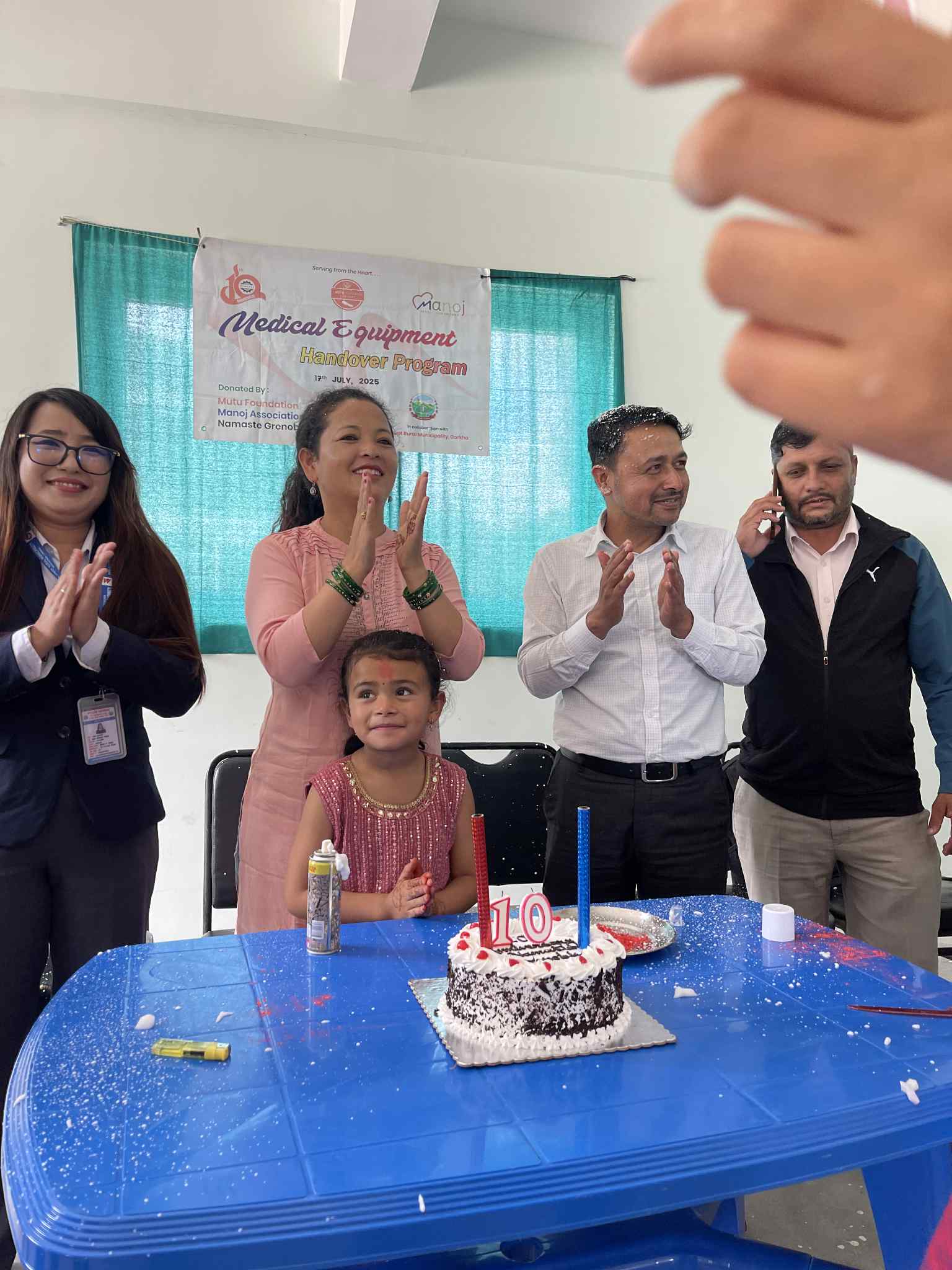 Le gâteau a été dégusté avec les soignants et les élus de la Municipalité d’Ajirkhot à Bhachchek, dans le nouvel hôpital de la petite ville. Manoj/Mutu Foundation contribuent progressivement à son équipement (notamment le matériel de la salle d’accouchement, voir les photos).