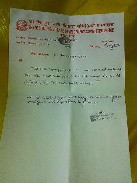 Dhan est reparti avant hier à Simjung, il était accompagné de médecins népalais du Nepal Eyes hospital et de membres de Pran Nepal. Nous avions travaillé avec eux en octobre dernier lors du camp de santé d’ophtalmologie et de dépistage de la cataracte au dispensaire. Notre collaboration avait été amicale et efficace. Nous formons désormais un trio dans l’organisation médicale et la gestion de l’urgence pour mettre le VDC de Simjung dans la sécurité et la voie de la reconstruction. Un ingénieur népalais est toujours sur place pour visiter l’ensemble des villages sinistrés. Une équipe de télévision népalaise les a accompagné afin de témoigner des conséquences dramatiques du séisme dans cette région du Népal..