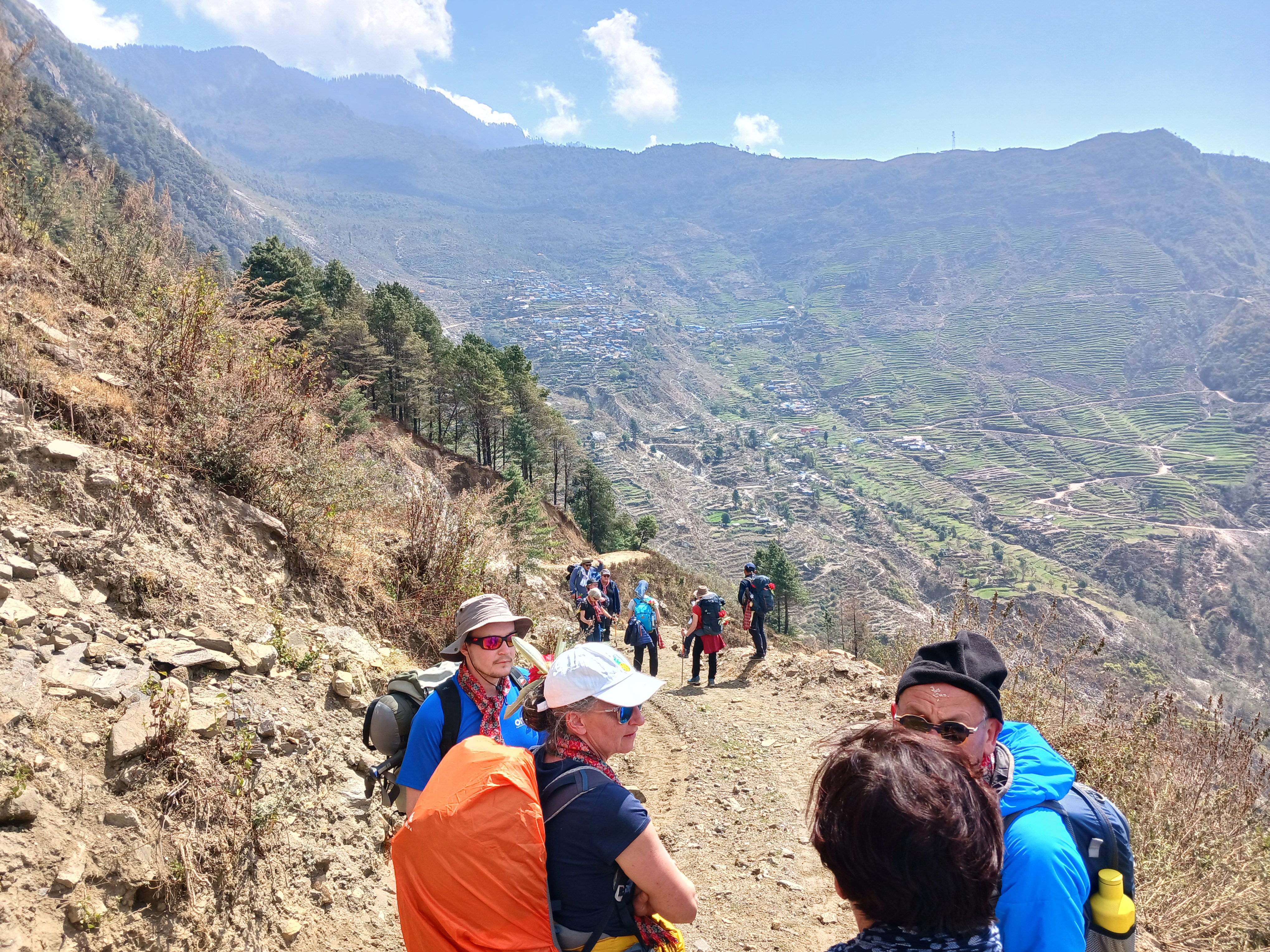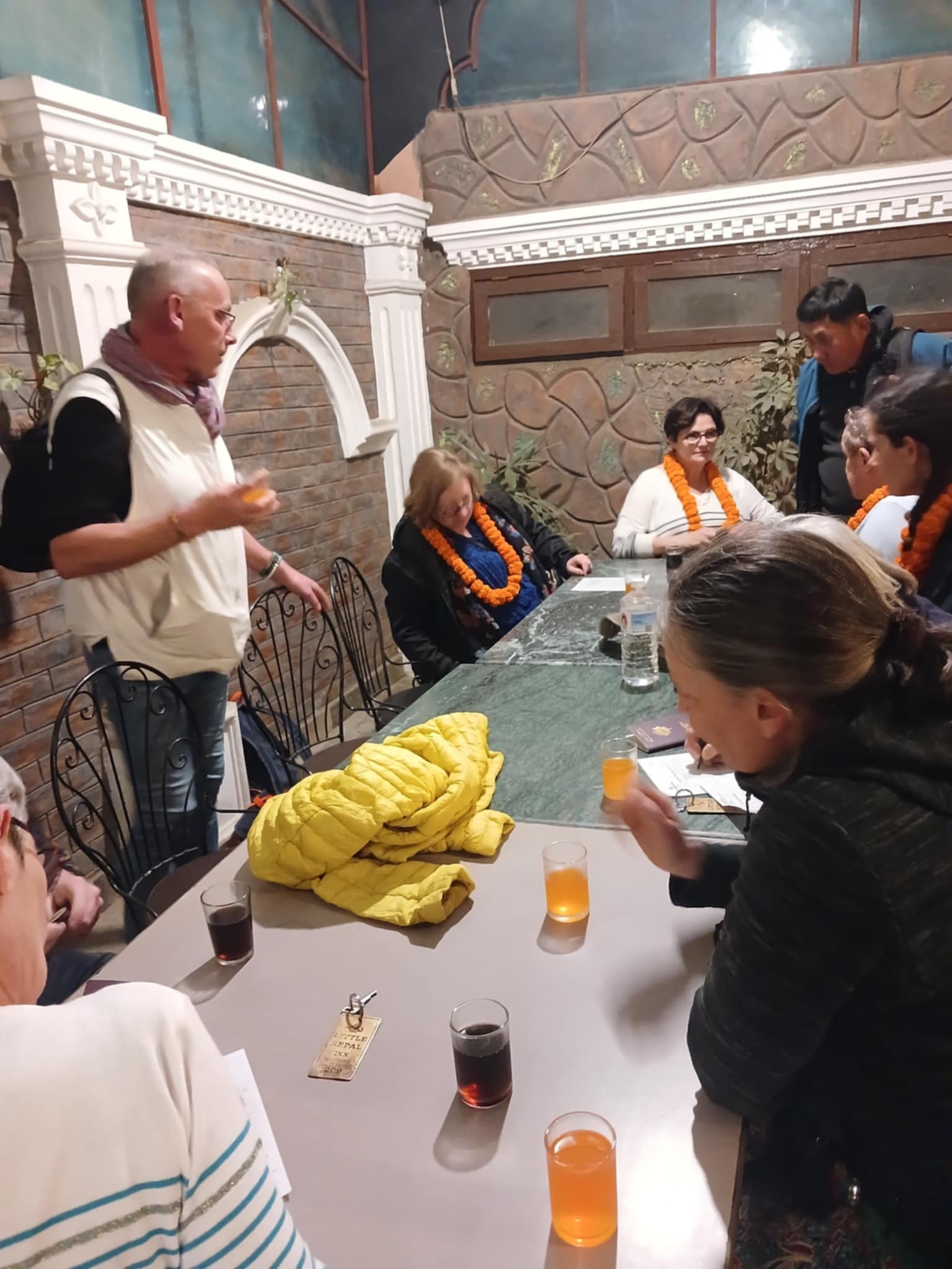 Le 28 février, la seconde partie puis la troisième partie de l’équipe sont arrivées ! 11 personnes en tout avec Dhan. Après un après-midi passé à l’aéroport pour Dhan et Laurent (arrivé 2 jours plus tôt), la team a été réunie : Jean, Isabelle T, Martine, Pierre-François, Laurence (membre du CA), Fabienne, Servane, Laurent (membre du CA), Isabelle LD et Claire (membre du CA). Une belle tablée ! A côté des formalités pratiques (enregistrement à l’hôtel, briefing par Dhan, change de devises, etc.), il a fallu préparer les sacs, ce qui n’a pas été si évident. En effet, il y a 3 sous-équipes dans l’équipe. Elles se diviseront au fur et à mesure de la mission, et pour les parties de treks, il faut répartir les affaires des marcheurs entre les porteurs.