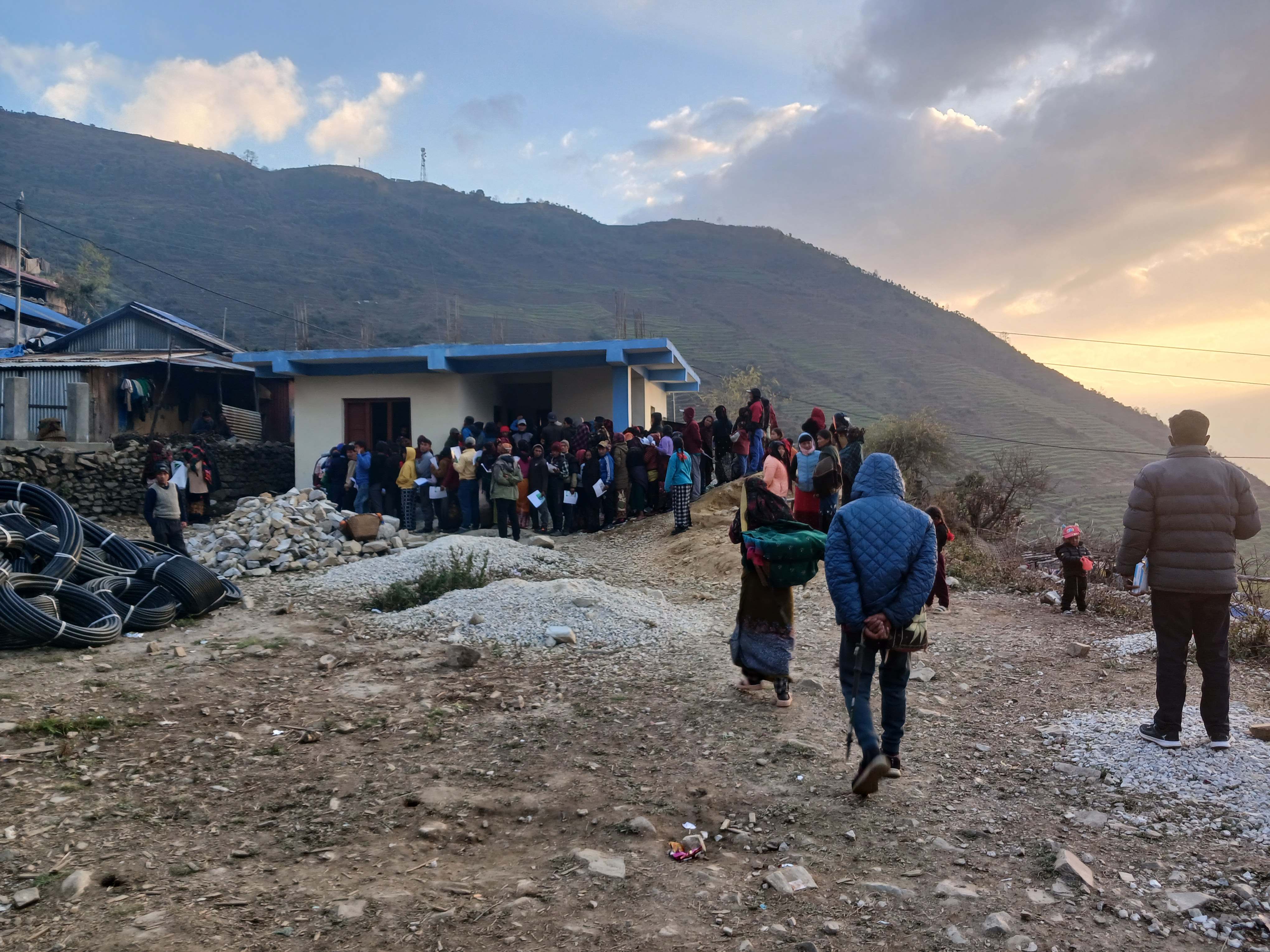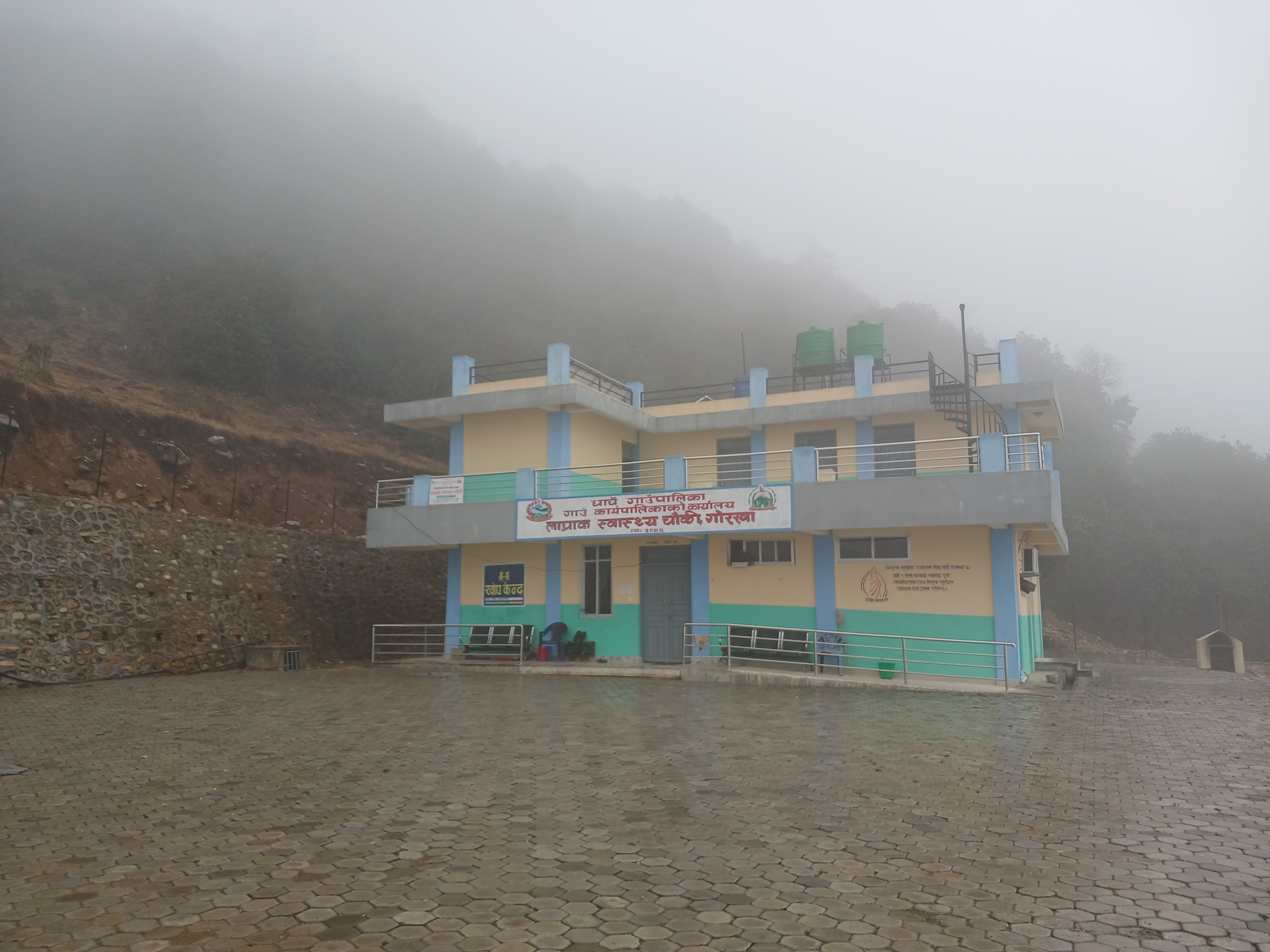 Le 11 mars, nous nous sommes rendus dans le district du Lamjung en 4×4 (municipalité de Dordi) afin de visiter deux dispensaires et rencontrer les autorités de santé de la municipalité. Le premier dispensaire était celui de Pachok (ward 5). 6 personnes y travaillent à l’année et 10 à 20 consultations ont lieu par jour. 11 naissances ont eu lieu en 2023 et 4 depuis juillet 2024. Les accouchements ont lieu dans un bâtiment en contrebas, près de la rivière. Les conditions y sont rudes car les bâtiments sont petits, il manque du matériel et un incinérateur pour les déchets médicaux (pour le placenta notamment). Lorsque les accouchements sont compliqués, les patientes sont renvoyées à Besisahar, là où se trouve un plus grand hôpital public (à environ 2h), ou à Gorkha (à environ 4h).