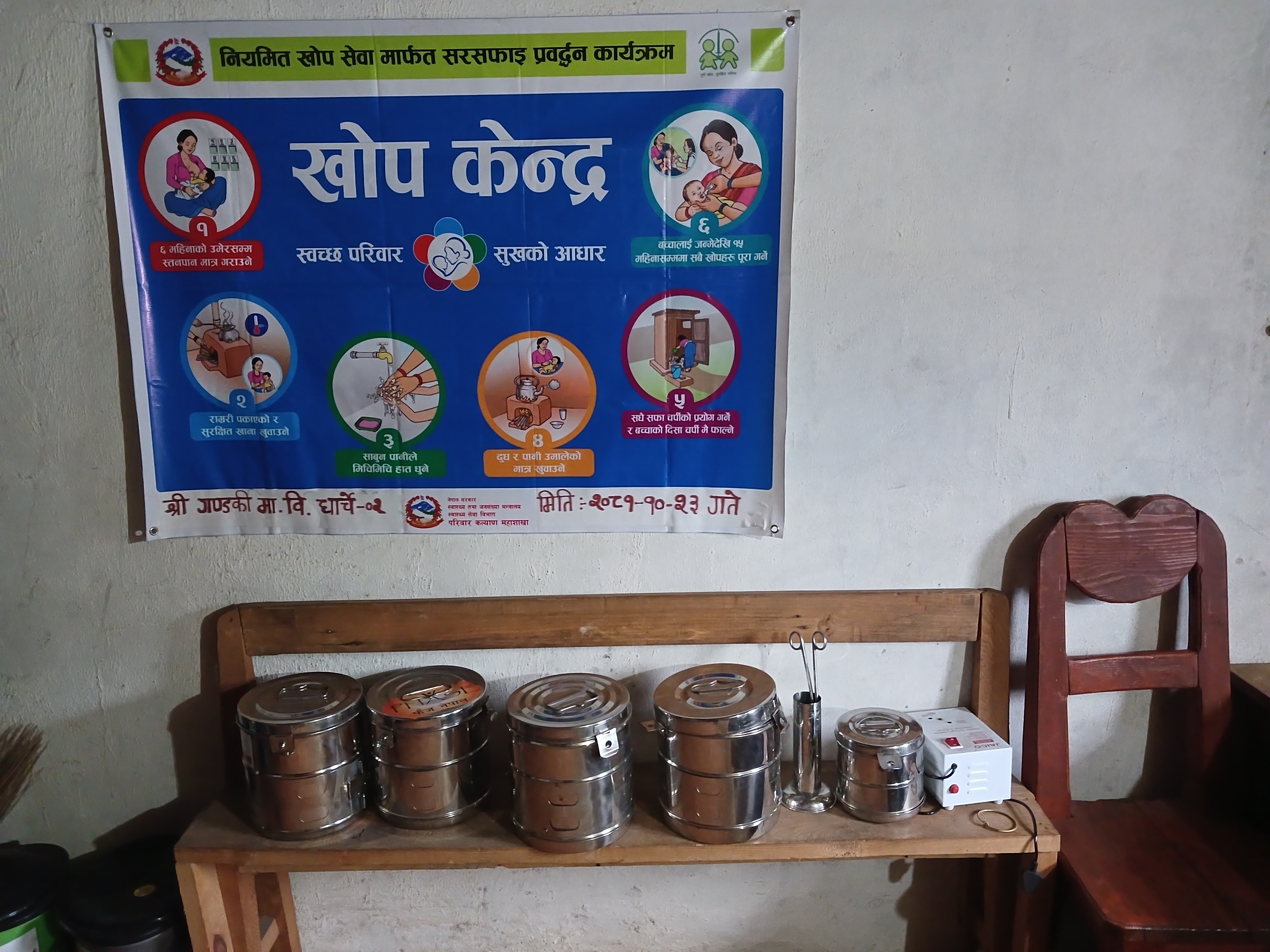 Nous avons posé des questions à propos des accouchements dans l’objectif de savoir s’il serait pertinent d’étendre le projet Aamako maya au-delà de la municipalité d’Ajirkhot, comme ici à Runchet. Le dispensaire dispose de tout le matériel nécessair pour les accouchements notamment d’une couveuse et d’un siège, financés par la municipalité.