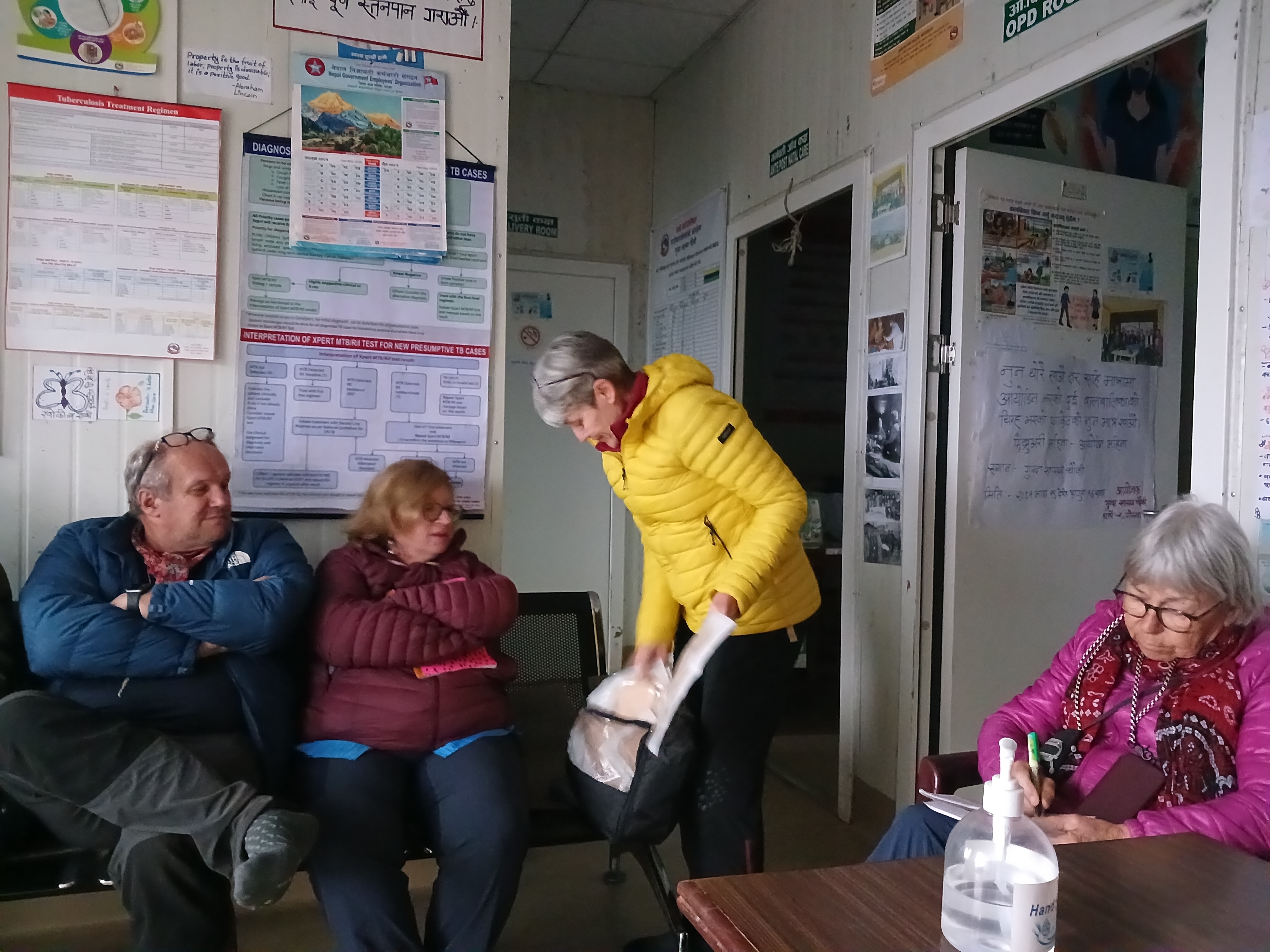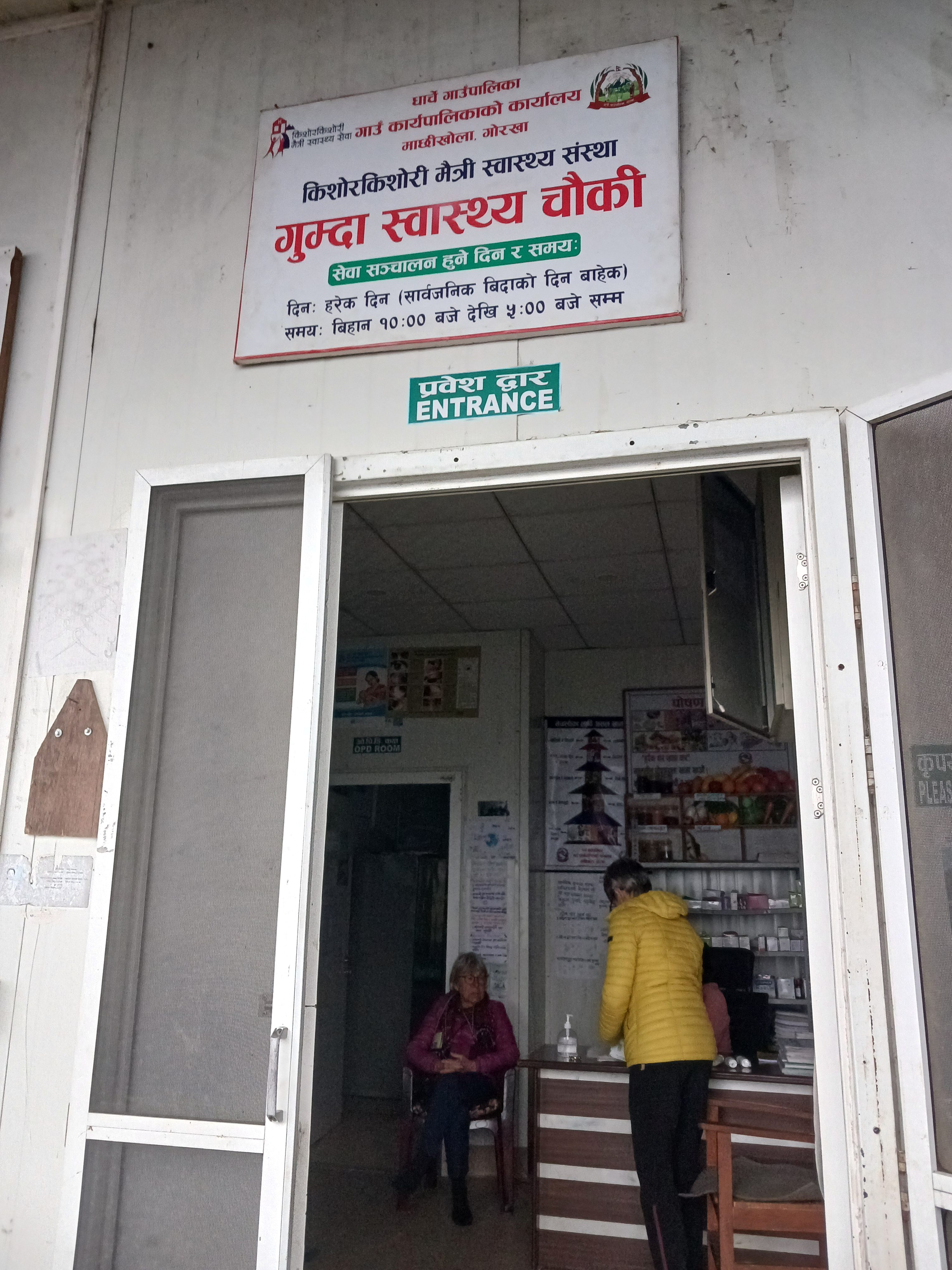 Puis nous sommes repartis en direction de Goumda (ward 5, municipalité de Dharche) en 4×4 puis à pied. Nous avons ensuite visité le dispensaire de Goumda, qui est également un birding center. Nous avons été reçus par une aide-soigante (community health worker). 5 à 6 consultations sont effectuées par jour et 6 à 7 accouchements par an. Comme dans le cas des dispensaires déjà visités, en cas de complications les femmes enceintes sont redirigées vers Gorkha ou Kathmandou. Le nombre d’accouchements est en baisse du fait de la prise croissante de contraception et de l’exode rural ou des départs à l’étranger, de plus en plus nombreux. Plus généralement, les soins les plus couranrs concernent les personnes âgées qui présentent souvent des problèmes d’articulations. Les intoxications du fait de la fumée (cuisine au feu de bois dans les intérieurs) sont également nombreuses.