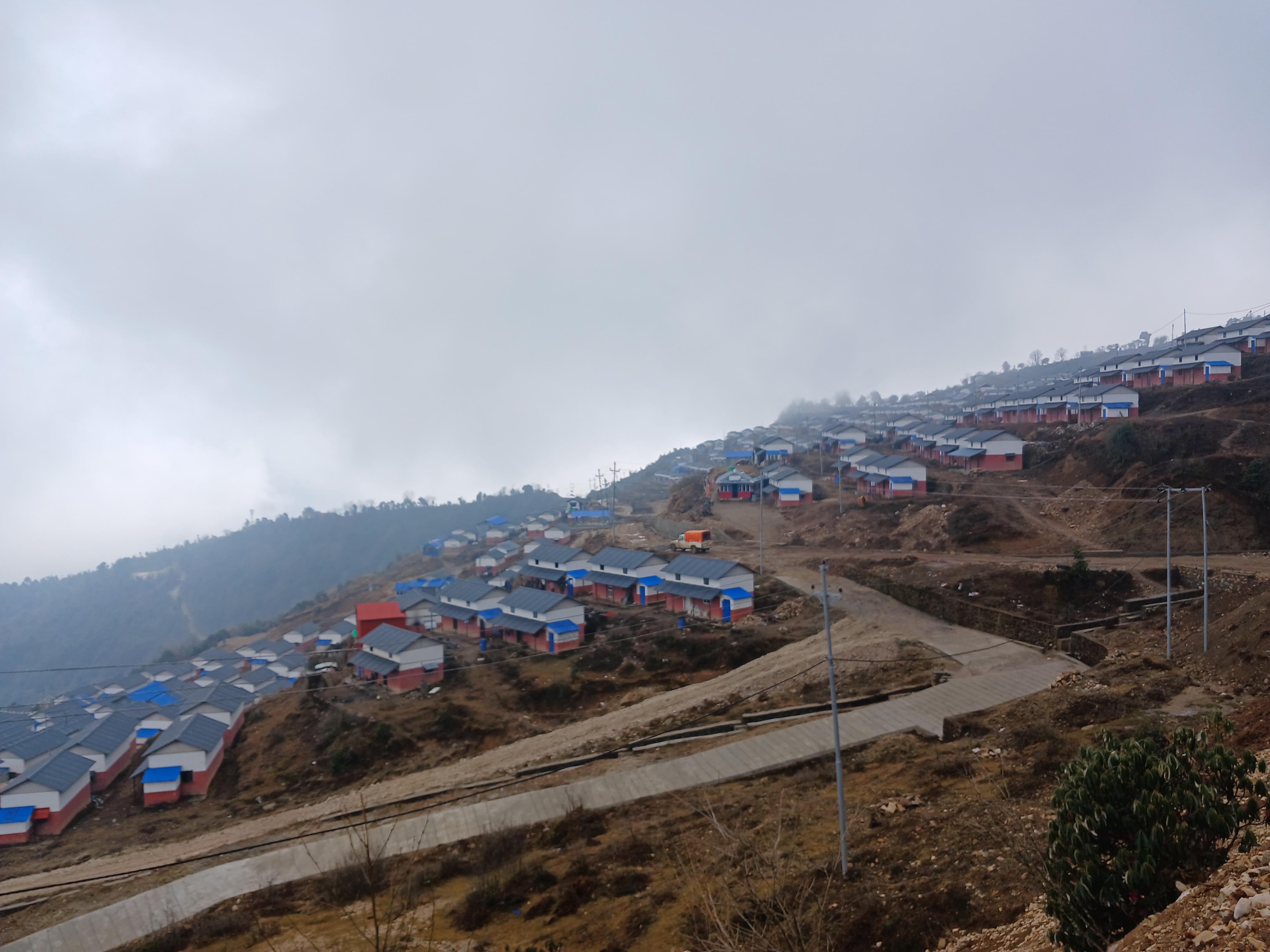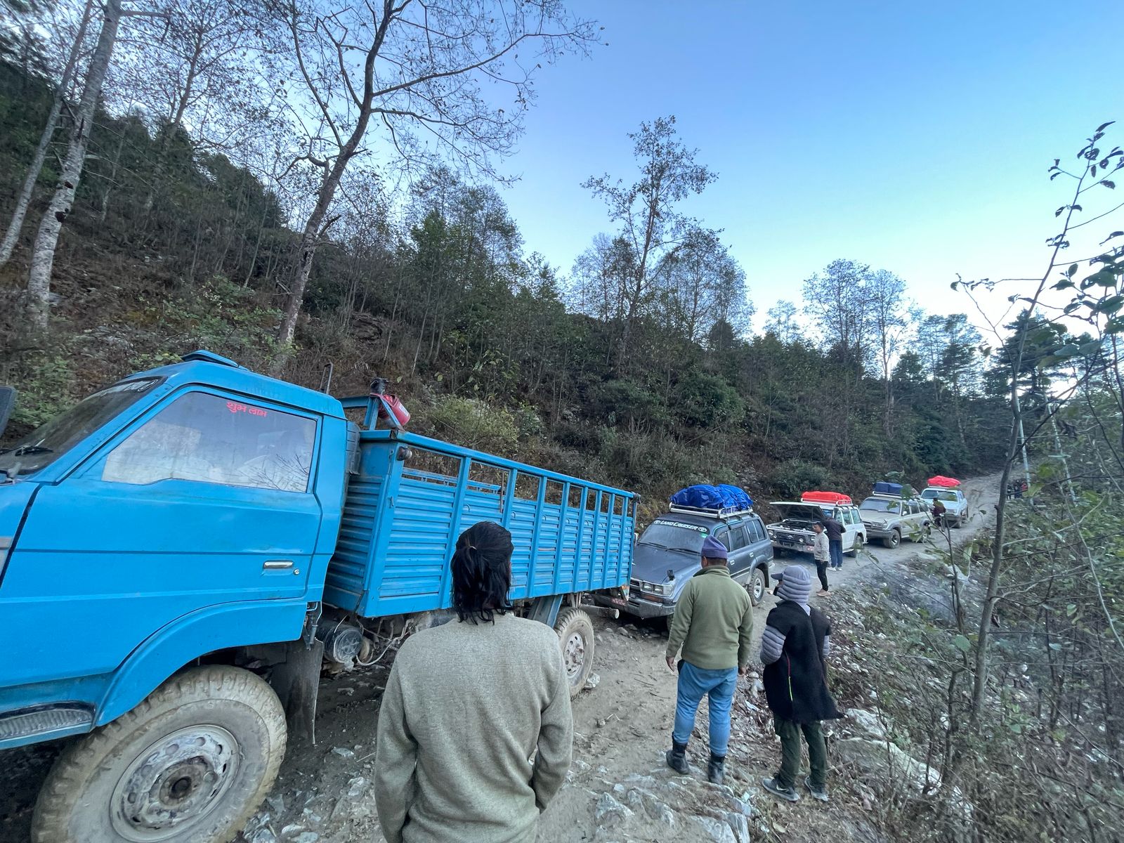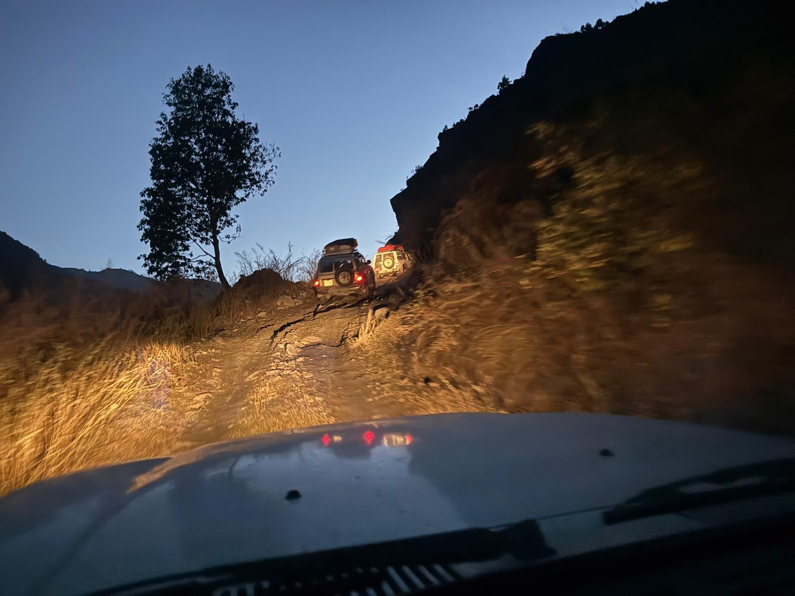 Nous avons roulé 12h en direction de Keraunja. Les deux dernières heures ont été éprouvantes car la nuit est tombée est tombée et la piste est très accidentée ! Il ne faut pas regarder la pente et l’étroitesse du chemin… Alors que nous continuions l’ascension, vers 19h les voitures ont été bloquées par un camion tombé en panne qui a été laissé par le chauffeur sur la route. Les coordinateurs et les chauffeurs sont partis à la recherche du chauffeur du camion dans le village proche (Kashigaun) mais il n’a pas été trouvé. Après un petit vent de panique, tout le monde a été dispatché soit chez l’habitant, soit dans un lodge vide. Après un apéro autour du feu, on nous a même servi un dhal bat ! Encore une fois merci à Dhan pour sa grande capacité d’improvisation. La nuit de sommeil a été la bienvenue !