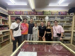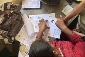 A leur arrivée, l’équipe a rencontré une collaboratrice de Sahin Pravin (la fondatrice du magasin Local Women Handicrafts et de la manufacture solidaire associée). Les pads (protections féminines réutilisables) destinées à être distribuées à Simjung sont fabriquées dans cette manufacture.
