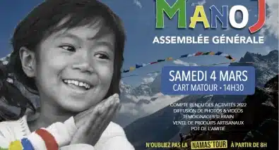 La prochaine Assemblée Générale de l’Association Manoj arrive à grands pas ! Elle aura lieu le samedi 4 mars dès 14h30 au CART de Matour (71). (Elle suivra la Namas’tour qui aura lieu le matin). Au programme de cette Assemblée Générale : – le compte-rendu des activités de l’association au Népal et en France en…