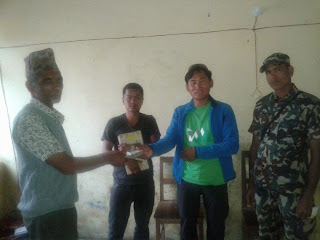Dhan remet l’argent de l’association entre les mains du président du VDC ( communauté de commune ) accompagné de son assistant et en présence du chef militaire local.