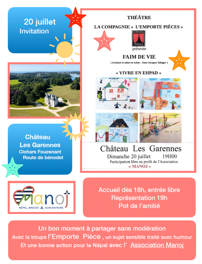 La compagnie « L’emporte Pièces » présentera la pièce Faim de vie, Vivre en EHPAD (écrite et mise en scène par Jean-Jacques Salager). La représentation aura lieu au Château des Garennes à Clohars-Fouesnant, le dimanche 20 juillet à 19h (en fonction de la météo, la pièce aura lieu en plein air ou sous un chapiteau). L’accueil se fera dès 18h.
