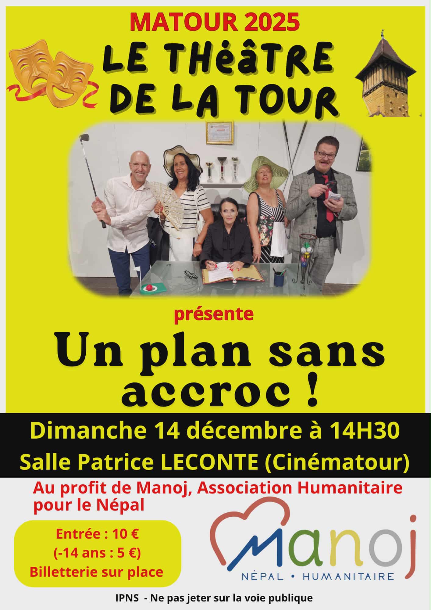 Une pièce de théâtre humoristique, « Un plan sans accroc », sera donnée en représentation par la troupe Le théâtre de la Tour, le dimanche 14 décembre à 14h30 dans la salle Patrice Leconte (Cinématour) à Matour (71).