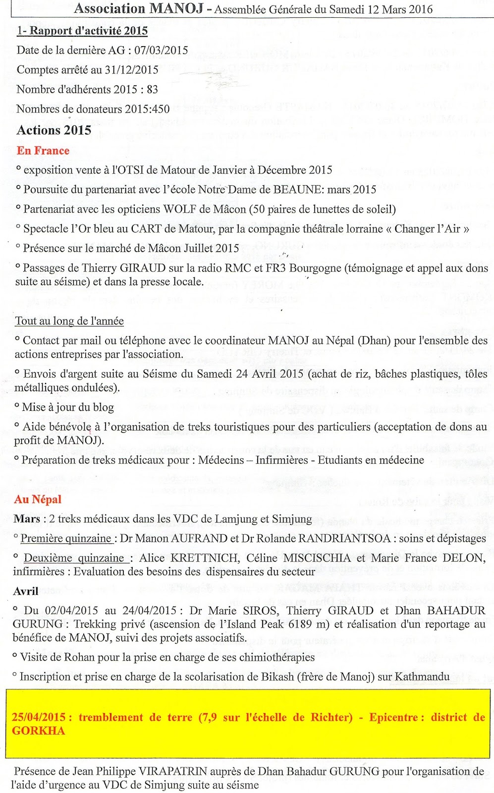 L’assemblée Générale de l’association MANOJ s’est tenue le Samedi 12 Mars 2015 en présence de 80 personnes. Le quorum étant atteint ( 83 adhérents: 42 pouvoirs et 22 adhérents présents ), le déroulement de l’assemblée a pu se poursuivre avec un grand nombre de reportages vidéos et photos ( voir ci dessous ) illustrant une année 2015 très chargée.